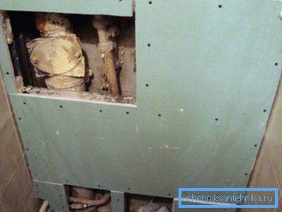 Die Wand aus Gipskartonplatten ist stark genug, zuverlässig und es ist praktisch, sie zu überarbeiten. Wie bereits erwähnt, besteht in den Badezimmern die Wahrscheinlichkeit, dass die Barriere dringend beseitigt werden muss, um den Zugang zur Kommunikation zu gewährleisten.